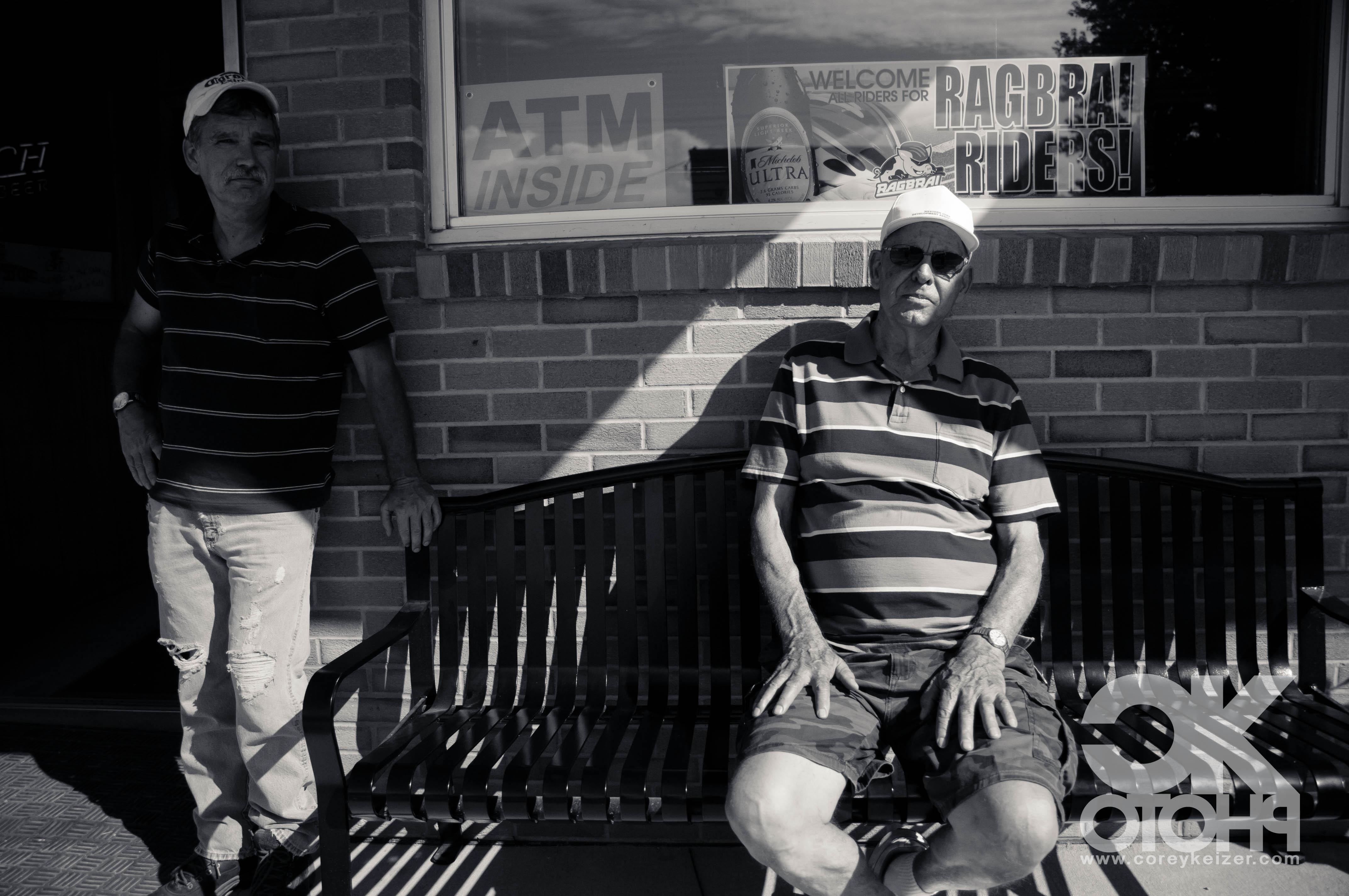 In each of the “Thru Towns” or towns that the route went through, but didn’t technically stop in, there was stuff going on. Riders drinking in bars at 9:00 a.m., bands playing, people dancing in the streets. Inevitably there were locals looking on. These two had what seemed like a disapproving glare over the whole event, but when asked about RAGBRAI were both surprisingly positive