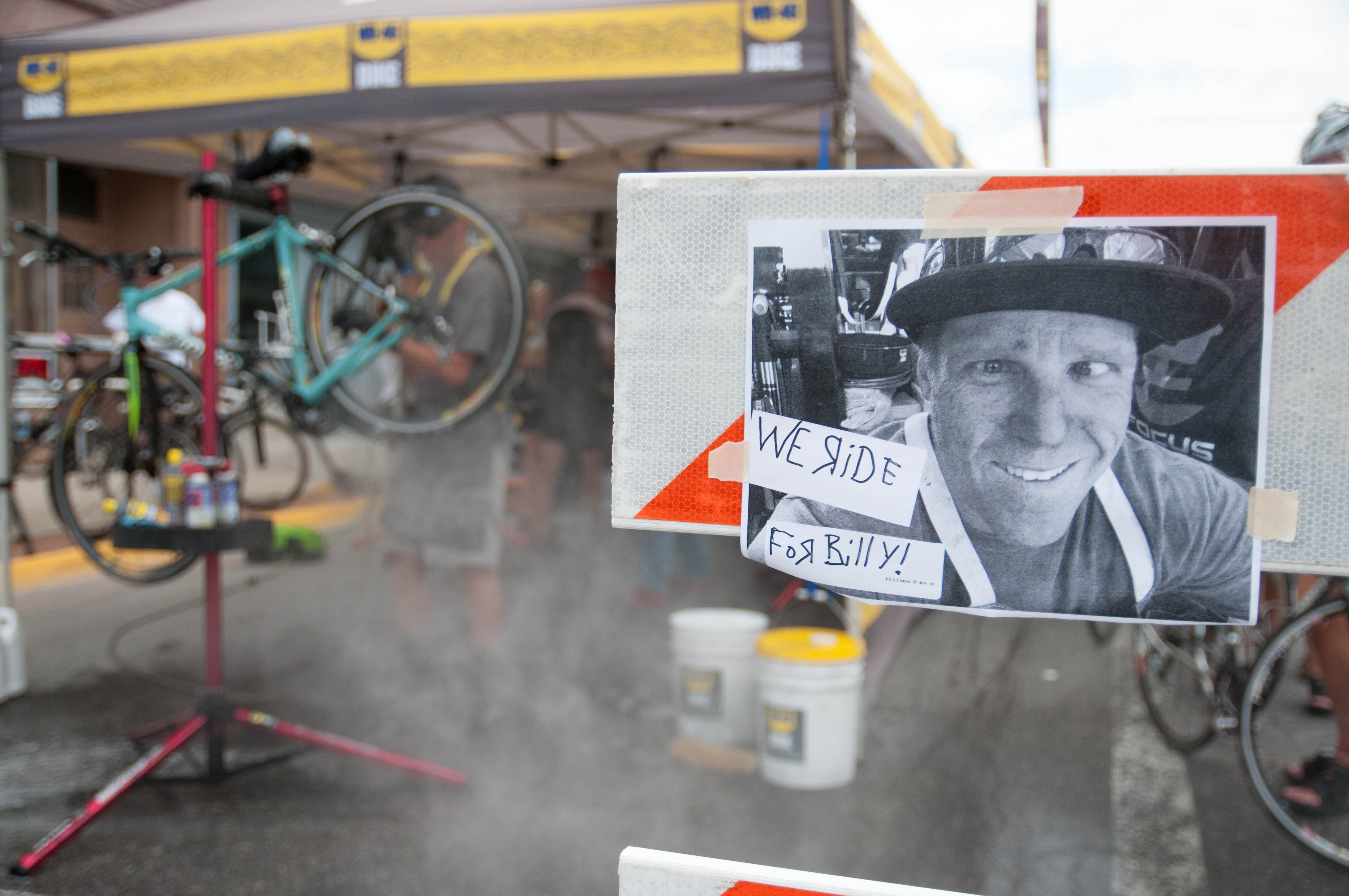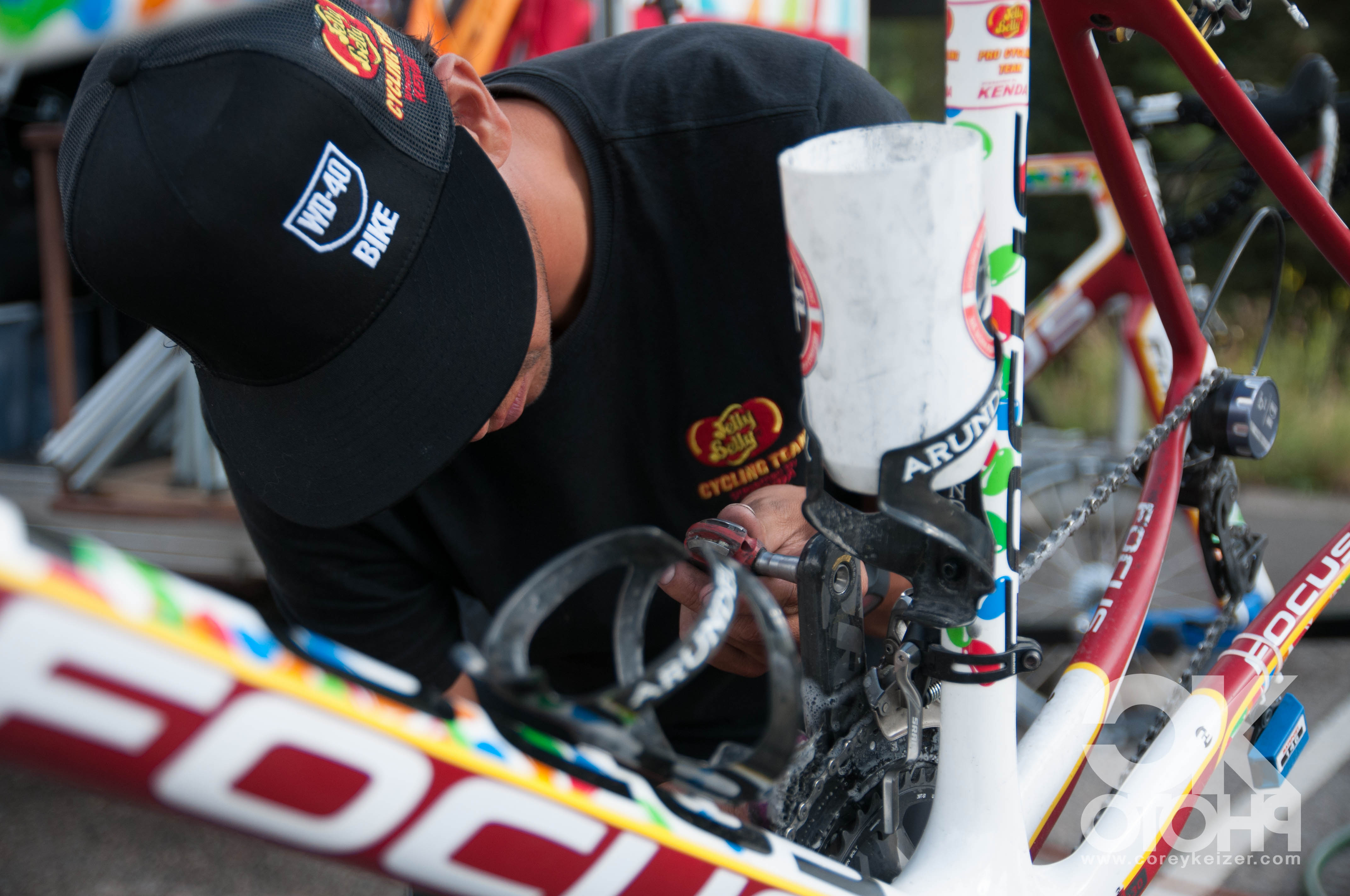 As the week went on we all became more and more road weary. We grew more and more punchy. Nothing exemplified this more than when Bill Marshall, one of the WD-40 Bike techs gave me this cross eyed grease covered look as I took his picture with my iPhone while he was powering through a can of Budweiser. Later that night my creative director and one of the WD-40 Bike Tech’s were going through photos and they saw this one. We decided that a funny prank would be to make hundreds of copies of that photos and post them up around the finish town where the WD-40 Bike tents would be set up. So we did. That’s Bill in the background working.